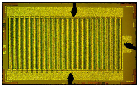 The RADFET devices [21] were fabricated using the 6 m CMOS technology compatible with CD4000 logic IC series. The radiation sensor is shown in Figure 1. It consists of two RADFET devices placed in a single ceramic package. Every RADFET is a PMOS device with a channel length of m and a channel width of m. The n-type silicon wafer doped by phosphorus was used as the substrate. The silicon substrate has 4.5 Ohms per square resistance and <100> orientation. The gate dielectric is silicon dioxide with 100 nm thickness. The total device area is 1,600,000 m2. Micron technology and relatively thick gate dielectric is preferable for RADFET fabrication. The thinner gate dielectric gives the decrease in RADFET sensitivity [33]. The dielectric thickness higher that 100 nm makes sufficient more difficult to implement the Fowler–Nordheim injection mode [34,35].