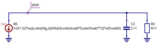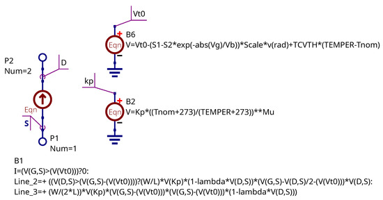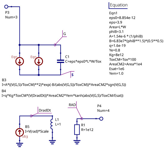 The Equation block in Figure 6 represents the parameters calculated before the simulation using the subcircuit parameters. This block is mapped to .PARAM block in the SPICE netlist. The B1 source represents the drain current level 1 MOSFET model with Equations (1) and (2).The transconductance parameter is represented as the virtual voltage. The B2 source is responsible for transconductance temperature dependency (4). The B3 and B4 current sources represent the gate injection (12) and radiation (13) currents respectively. The capacitor C1 is the gate capacitance (11). The L1 inductor and B5 source are a differentiation stage and serve to obtain the radiation intensity using the fundamental properties of inductor current. The B6 controlled source represents a threshold voltage shift dependency on the absorbed dose taking into account gate bias. It relates to Equation (7). The equations placed on schematic field are B-type sources component parameters. It’s shown how to convert the equations to SPICE notation.