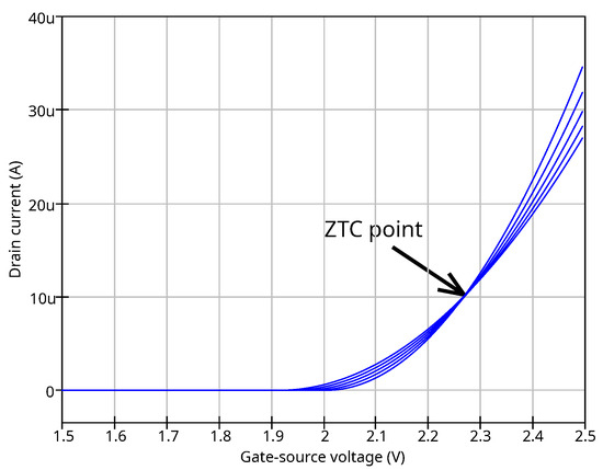An example of the temperature parameters extraction is shown in Figure 8. The ZTC point for the used device achieved at the drain current A. The interception points of the IV-curves shown in the figure is located near 10 A current.