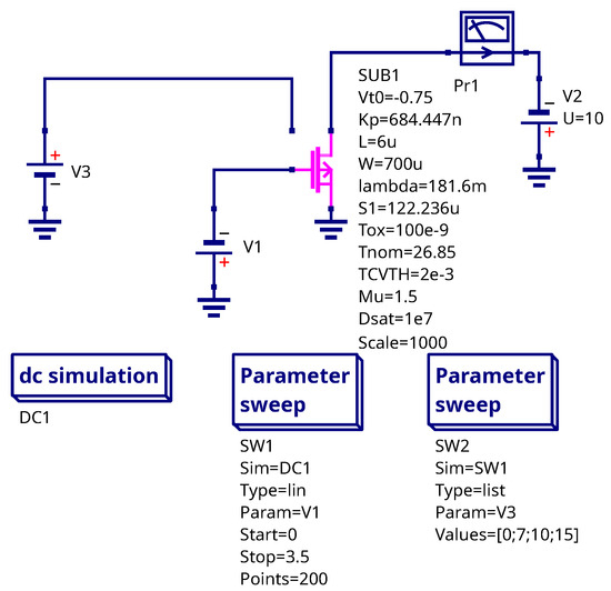 The sensitivity extraction requires the measurement of the I–V curves under different irradiation levels. We have measured the curves for three irradiation doses: 7 krad, 10 krad and 15 krad with no bias applied at gate. This data was used for sensitivity extraction. The testbench schematic in Qucs-S is shown in Figure 9. The V3 voltage source represents the absorbed dose input. The voltage at this terminal is equal to the dose in rads. Experimental results were obtained using an experimental setup implemented using a PXIe-4135 precision current/voltage generator/meter (National Instruments, Austin, TX, USA), which is a module of the PXI series from National Instruments. The setup is comprehensively described in [18].