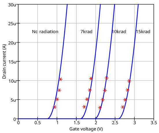 The simulated and measured I–V curves are shown in Figure 10. The figure shows four I–V curves. The measurements were taken without radiation and under radiation levels 7 krad, 10 krad, and 15 krad. The gamma-ray 60Co source was used.