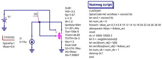 The threshold voltage can be measured by connecting the MOSFET drain and gate to a current source while grounding the source terminal. When the source current is in the microampere range, the voltage at the drain node closely approximates the threshold voltage. The testbench schematic and the sensitivity extraction script are shown in Figure 11. Nutmeg, the scripting language of the Ngspice simulator, is used to assemble a vector representing the dependency based on the results of a single-point DC sweep simulation.