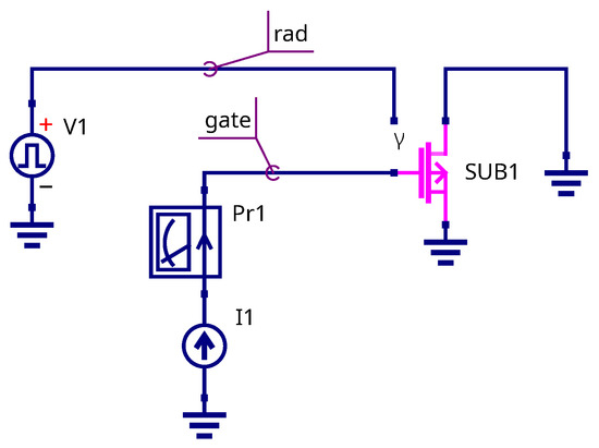 The study presented in [22] demonstrates that utilizing gate charge injection in RADFET devices extends their range of applications. Circuit simulation enables the analysis and debugging of dosimeter circuits that operate with gate injection current. The testbench schematic for gate current simulation is shown in Figure 13. In this setup, a DC injection current source (I1) is connected to the MOSFET gate, while all other terminals are grounded. The pulsed voltage source V1 represents a virtual radiation beam, where the pulse rise time corresponds to the irradiation duration and the peak voltage represents the radiation dose D. During transient simulation, the gate voltage drop at the gate node is monitored. Both the drain and source terminals are connected to ground. The virtual current probe Pr1 is used to measure the gate current.