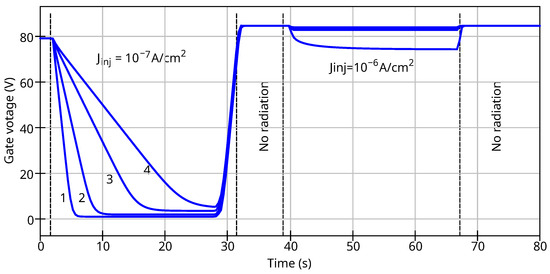 Waveform of the voltage at RADFET gate under injection and irradiation for different ratio of injection and radiation currents. 1—; 2—; 3—; 4—.