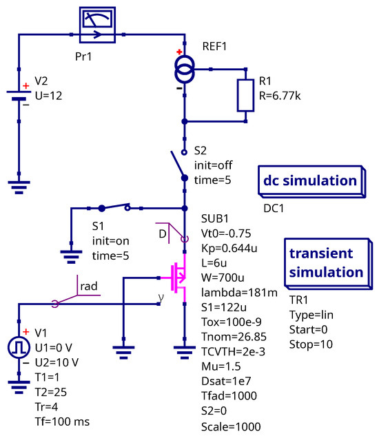 The designed compact model makes it possible to simulate the input stage of the dosimeter described in [43] along with its analog front end. The dosimeter input schematic is shown in Figure 15. The LM334 current source IC (REF1) provides a constant current to the drain and acts as an adjustable current source, which is commonly used in dosimeter readout circuits. The resistor R1 sets a current of 10 A, with its selection guidelines available in the IC datasheet. A SPICE macro model for the LM334 IC is supplied by the device vendor. Switches S1 and S2 are used to simulate the irradiation and measurement phases, respectively. The pulsed voltage source V1 represents a virtual radiation input, where its high voltage level U2 corresponds to the total accumulated dose. The 1 V voltage at the radiation input (wire labeled with rad) represents 1 krad dose. The rise time Tr of the pulsed source represents the duration of the irradiation phase. The delay T1, defined as the time between the start of the simulation and the beginning of the pulse, is used to improve the visual clarity of the simulation plots and can be set arbitrarily. The total pulse duration T2 should be longer than the overall simulation time. At the start of the simulation, switch S1 is closed and S2 is open. The states of the switches change at time . During irradiation, all electrodes of the RADFET are connected to ground, and the sensor operates under exposure. When the irradiation phase ends, S1 opens and S2 closes, switching the MOSFET into the measurement circuit. Under these conditions, the drain voltage corresponding to the selected drain current range is approximately equal to the MOSFET threshold voltage . The virtual current probe Pr1 is used to monitor and verify the DC operating point of the circuit.