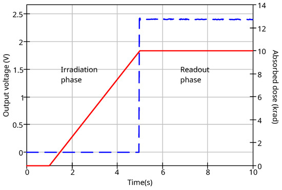 The simulated output voltage and input radiation dose are shown in Figure 16. During the irradiation phase, the drain voltage is equal to zero because the RADFET is disconnected from the readout circuit and its terminals are shorted. In the readout phase, the drain voltage is approximately , since the applied dose (10 krad) does not approach the saturation region and no gate bias is applied during irradiation.