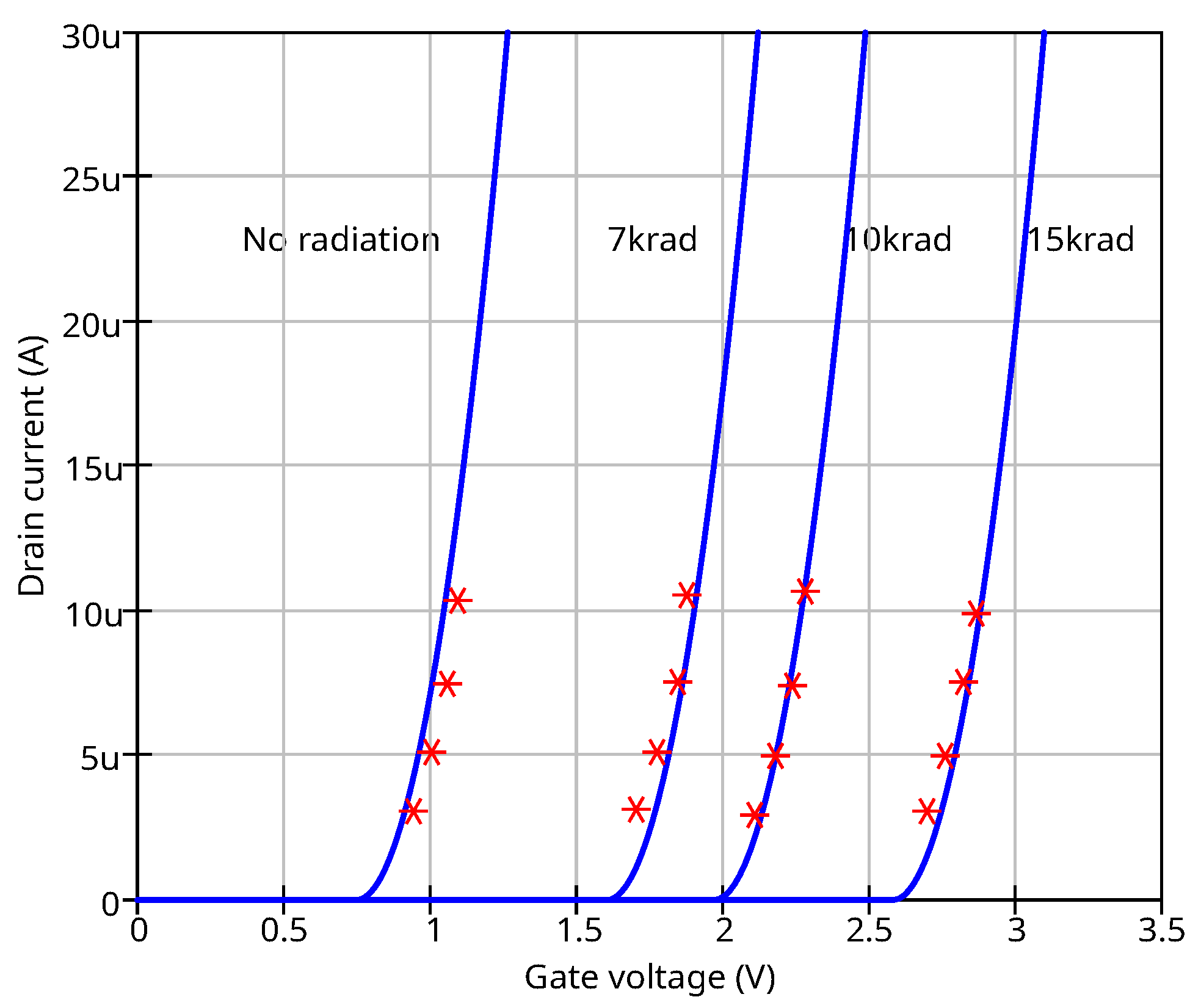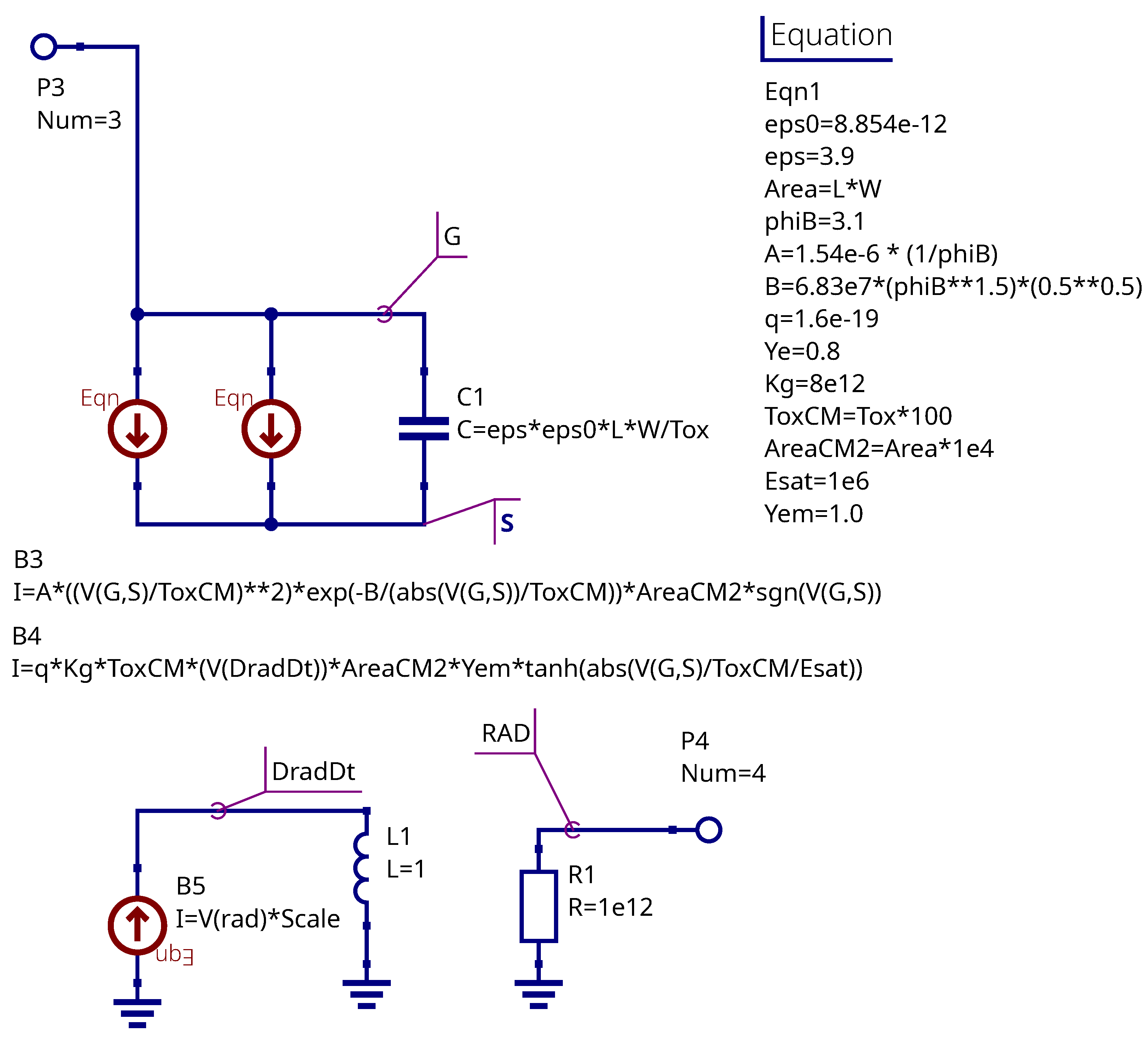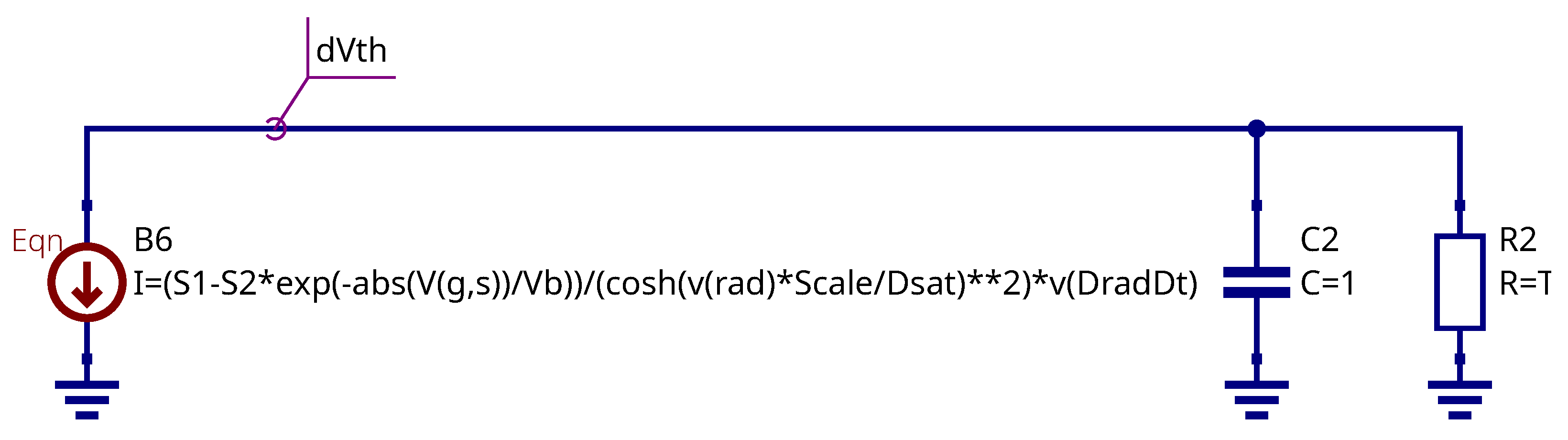 - Using XSPICE extensions [29,30]. XSPICE modules are written in C programming language with macros and also compiled as shared objects. XSPICE extension are much more difficult to design, but allows to provide a more deep integration of the model and simulation kernel. XSPICE brings no benefit for RADFET model because of design difficulties and no possibility of direct export from schematic. The deep integration with SPICE simulation kernel provided by XSPICE is not required for RADFET device compact model.