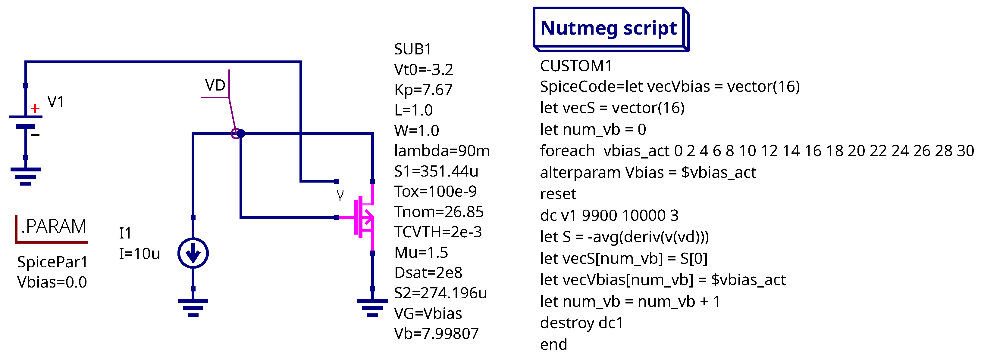 - Grabinski, W.; Scholz, R.; Verley, J.; Keiter, E.R.; Vogt, H.; Warning, D.; Nenzi, P.; Lannutti, F.; Salfelder, F.; Davis, A.; et al. FOSS CAD for the Compact Verilog-A Model Standardization in Open Access PDKs. In Proceedings of the 2024 8th IEEE Electron Devices Technology & Manufacturing Conference (EDTM), Bangalore, India, 3–6 March 2024; pp. 1–3. [Google Scholar] [CrossRef]