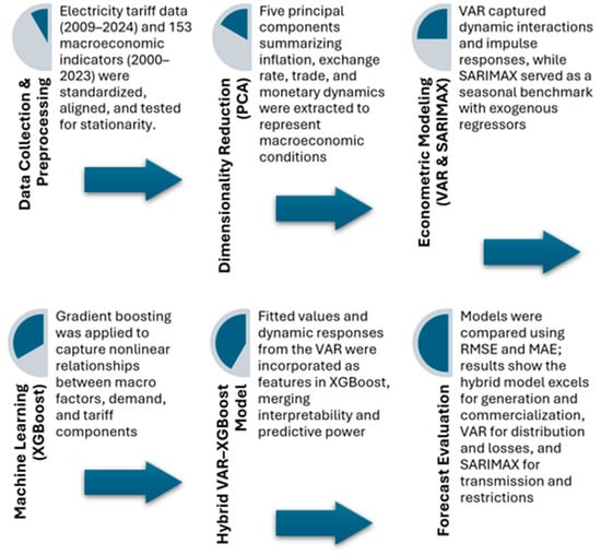 The methodological framework of this study integrates econometric modeling with machine learning techniques in order to capture the dynamic influence of macroeconomic variables on electricity tariffs and improve forecasting accuracy. The analysis follows a multi-stage process. First, we construct a comprehensive dataset combining monthly macroeconomic indicators and electricity tariff components from Colombian distributors. Data preprocessing ensures consistency through standardization and imputation of missing values. Second, we apply principal component analysis (PCA) to reduce the dimensionality of the macroeconomic dataset, extracting latent factors that synthesize common trends and mitigate multicollinearity. Third, we estimate traditional econometric models, including vector autoregressive (VAR) and seasonal autoregressive integrated moving average with exogenous regressors (SARIMAX), to model the interactions between tariffs and macroeconomic factors. Fourth, we implement the extreme gradient boosting algorithm (XGBoost) as a machine learning alternative capable of capturing nonlinear patterns in the data. Finally, we develop a hybrid VAR–XGBoost framework, where impulse-response dynamics from the VAR model are used as explanatory features within XGBoost, thus combining the interpretability of econometric analysis with the predictive power of ensemble learning. Model performance is assessed using standard forecasting metrics (RMSE, MAE), allowing for a comparative evaluation across methods. Figure 1 shows the stages of the methodology.