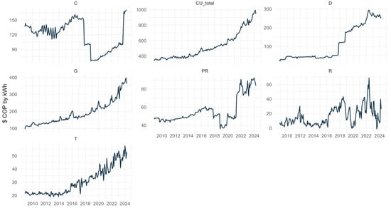 The second dataset comprises electricity tariff information from 16 major Colombian electricity distributors, collected from January 2009 to June 2024. For each distributor, the series reflects the tariff applicable to regulated users under low-voltage service conditions, consistent with national regulatory definitions. The tariff structure is disaggregated into six components: generation (G), transmission (T), distribution (D), commercialization (C), restrictions (R), and losses (PR). A national monthly average was computed across distributors to obtain a homogeneous series suitable for aggregate analysis (see supplementary material).