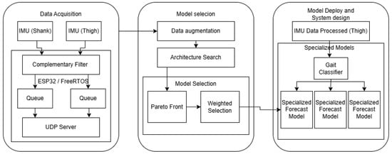 The overall workflow of the proposed framework is summarized in Figure 1. It comprises three main stages: (i) data acquisition, (ii) model selection, and (iii) system deployment. In the first stage, thigh- and shank-mounted IMUs capture motion data, which are filtered and transmitted via an ESP32 microcontroller running FreeRTOS. The second stage involves data augmentation, architecture search, and model selection through a Pareto analysis combined with a weighted evaluation. Finally, the selected models are deployed on embedded hardware, where a gait classifier dynamically assigns input sequences to specialized forecast models optimized for short, natural, and long stride patterns. This modular design ensures both predictive accuracy and computational feasibility on resource-constrained platforms. The subsequent subsections describe each stage in detail.