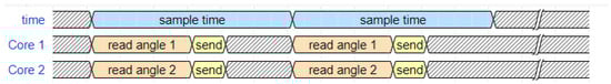 Timing Diagram of the Data Acquisition System. The diagram illustrates the parallel and synchronous data processing, where each core of the ESP32 microcontroller (Cores 1 and 2) is assigned to read the angle and send data from one IMU sensor (thigh and shank, respectively), ensuring accurate and simultaneous acquisition at precise intervals (sample time).