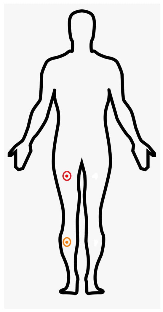 Placement of the IMU (MPU6050) sensors for gait motion capture. The thigh-mounted IMU was positioned on the lateral aspect of the right thigh, approximately midway between the greater trochanter and the lateral epicondyle of the femur (red cicle). The shank-mounted IMU was placed on the lateral aspect of the right shank, approximately midway between the head of the fibula and the lateral malleolus (orange circle). Both sensors were aligned with the longitudinal axes of their respective segments [27], and firmly secured using elastic straps to minimize movement artifacts.