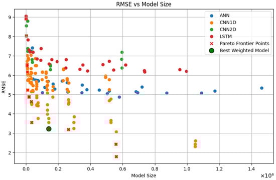 Scatter Plot of RMSE vs. Model Size with Pareto Frontier. The plot displays the trade-offs between accuracy (RMSE) and computational efficiency (Model Size ) for various architectures and highlights (Green Circle) the final model selected via weighted evaluation for deployment.