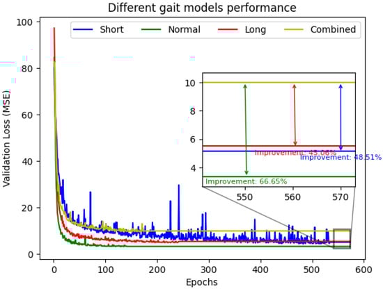 The proposed strategy produced substantial improvements in predictive accuracy across all gait types. As shown in Figure 6, the specialized models consistently achieved smaller validation losses than the combined model throughout training. In the final evaluation window, this translated into performance gains of 48.51% for short strides, 66.65% for natural strides, and 45.06% for long strides.