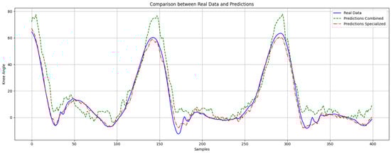 Figure 7 shows the measured knee angle (blue line) alongside the predictions from both the combined model (green line) and the specialized model (red line) throughout complete gait cycles. The specialized model closely followed the actual knee angle, while the combined model showed discrepancies, especially during rapid flexion and extension phases, highlighting the specialized model’s superior predictive capacity.