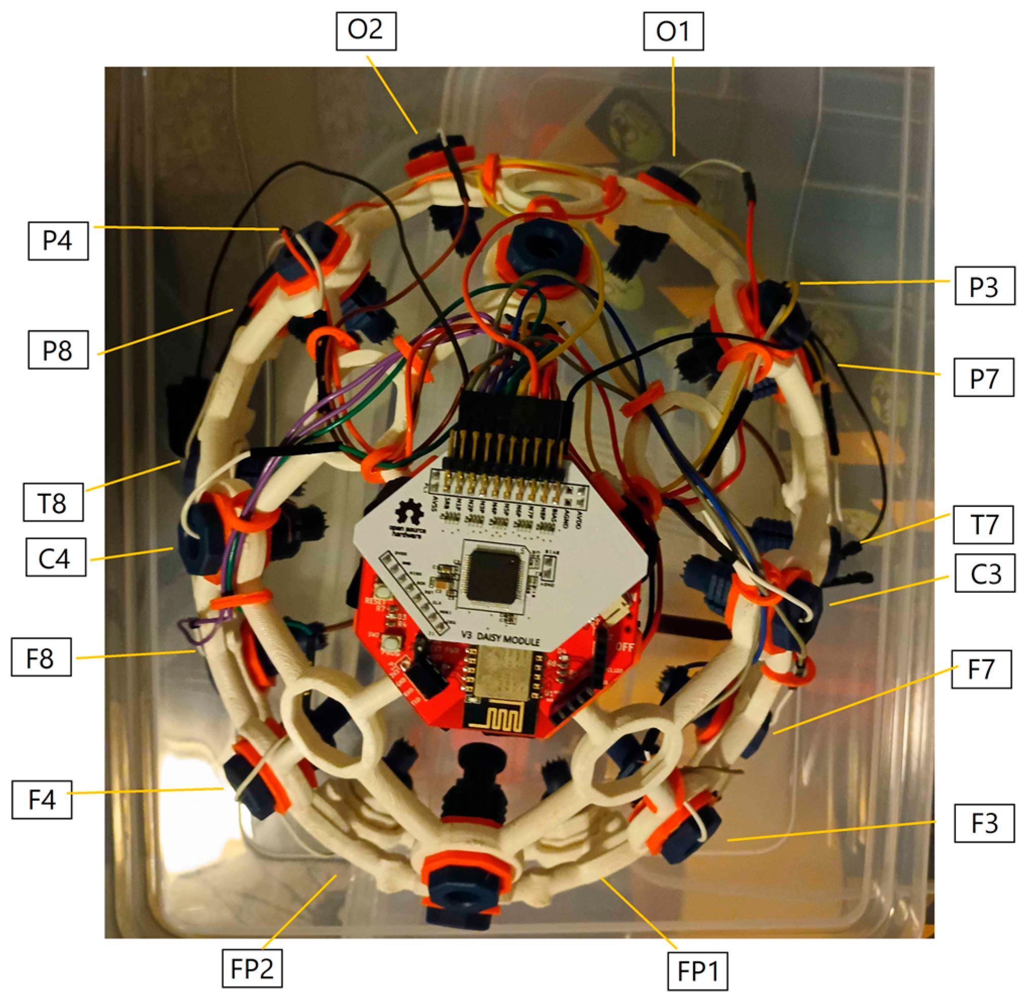 - Cardona-Alvarez, Y.N.; Álvarez-Meza, A.M.; Cárdenas-Peña, D.A.; Castaño-Duque, G.A.; Castellanos-Dominguez, G. A Novel OpenBCI Framework for EEG-Based Neurophysiological Experiments. Sensors 2023, 23, 3763. [Google Scholar] [CrossRef] [PubMed]
