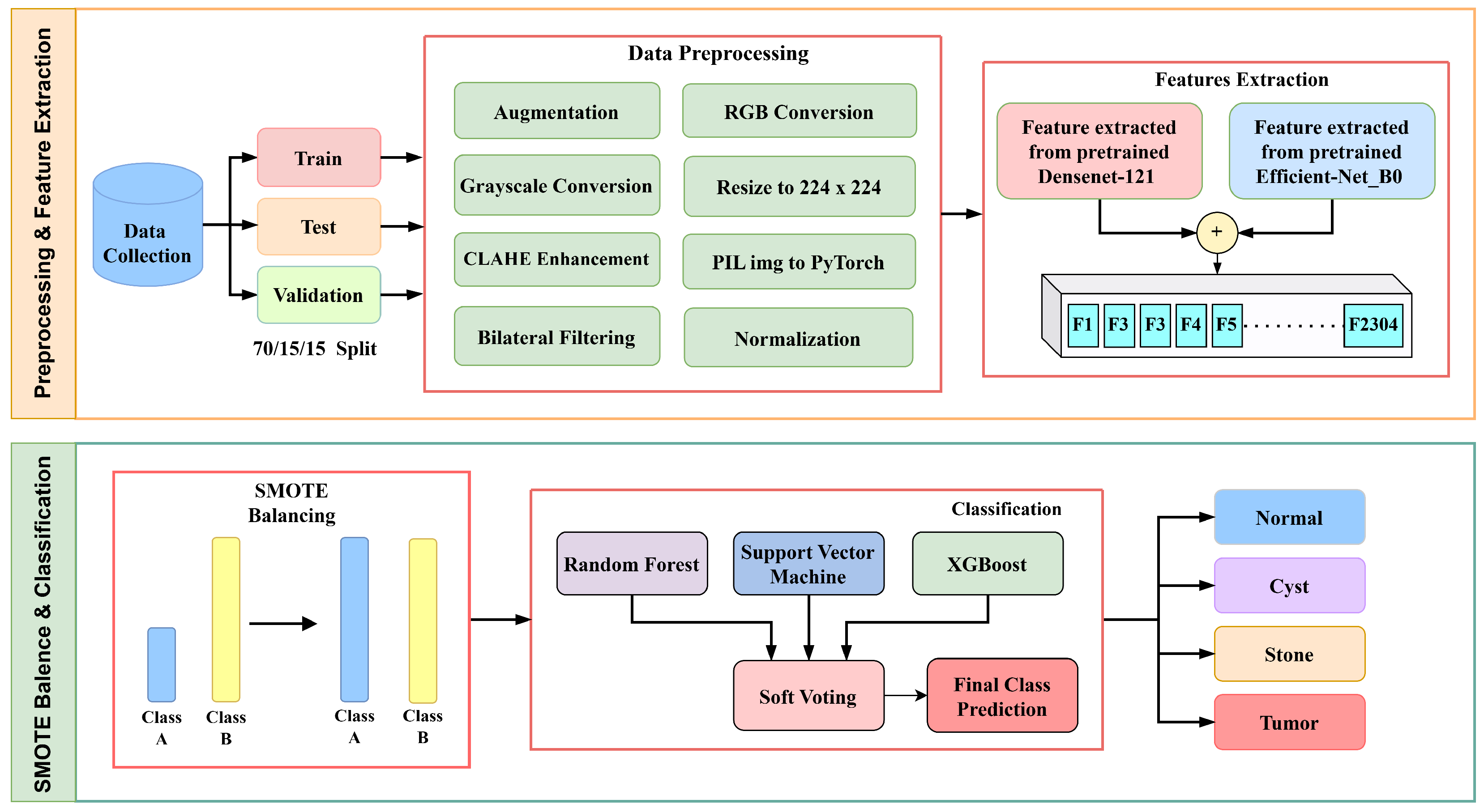 The proposed pipeline incorporates a class-balancing mechanism using the Synthetic Minority Oversampling Technique (SMOTE), ensuring equitable learning across imbalanced medical image categories and improving generalization for underrepresented kidney disease types.