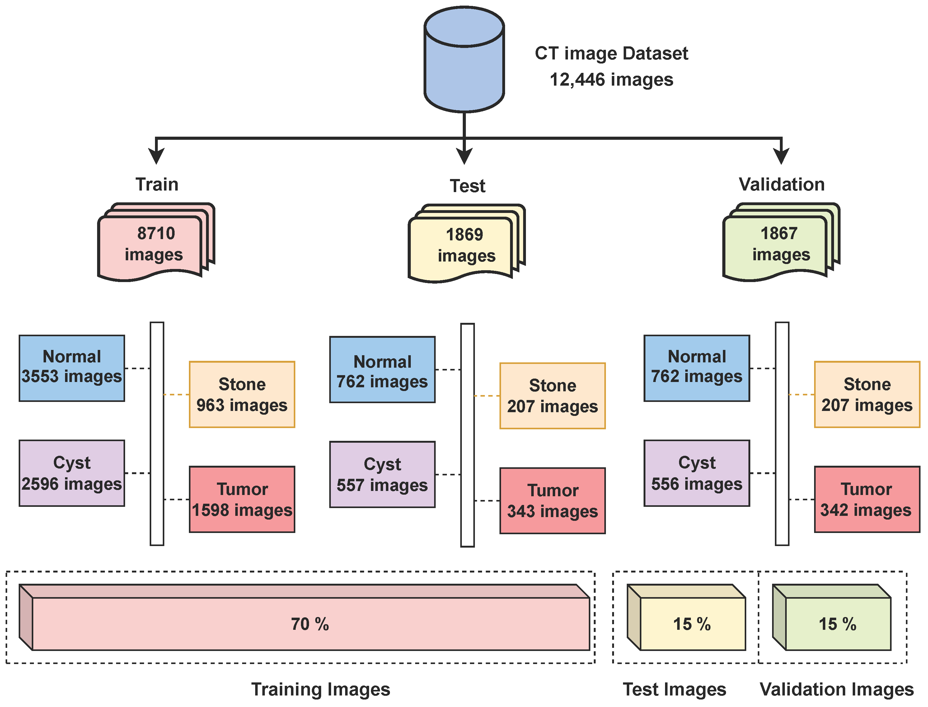 https://www.kaggle.com/datasets/nazmul0087/ct-kidney-dataset-normal-cyst-tumor-and-stone (accessed on 15 June 2025)). The dataset is publicly available and distributed under an open academic license on Kaggle, allowing reuse for research and publication purposes. All patient information was anonymized, ensuring compliance with ethical data usage standards. It includes four distinct classes—cyst (3709 images), normal (5077 images), stone (1377 images), and tumor (2283 images)—making a total of 12,446 labeled images. The dataset was split into a 70/15/15 ratio for training, testing, and validation, as shown in