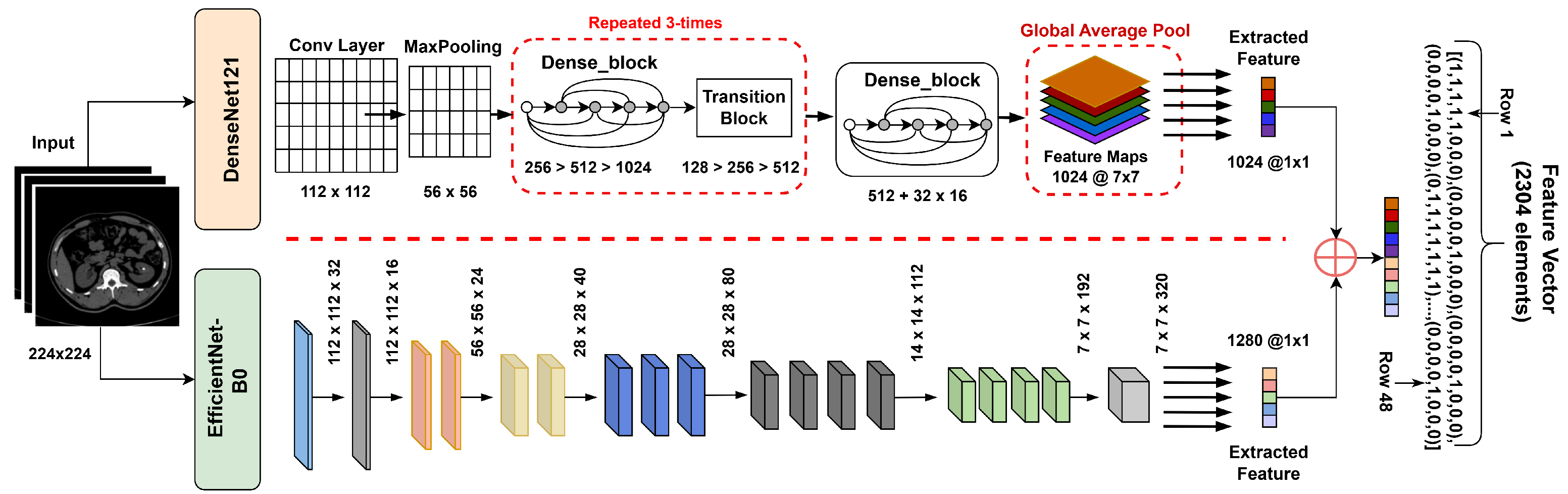 To leverage the complementary representations of both networks, their respective feature vectors (1024- and 1280-dimensional) were concatenated as shown in Equation (