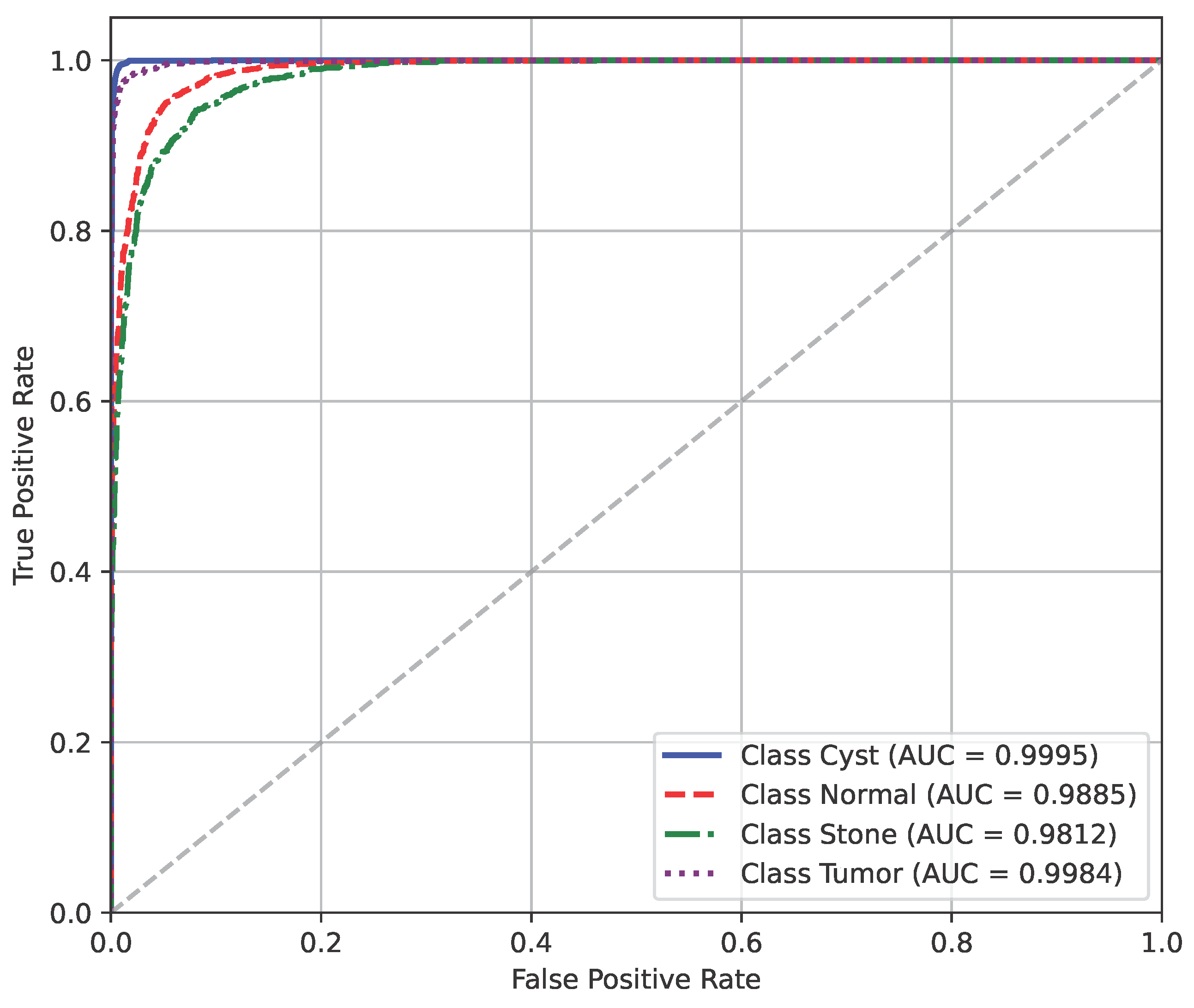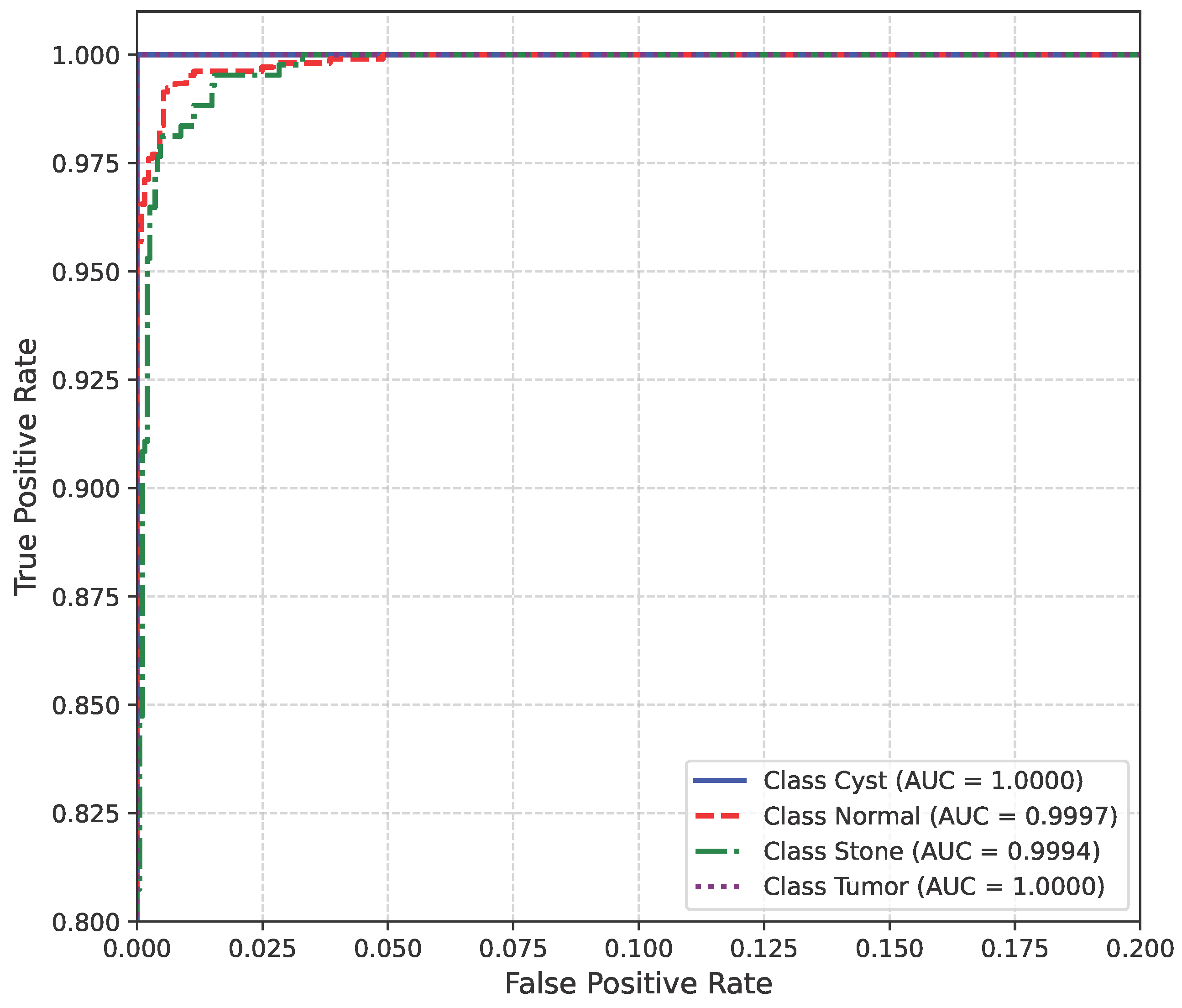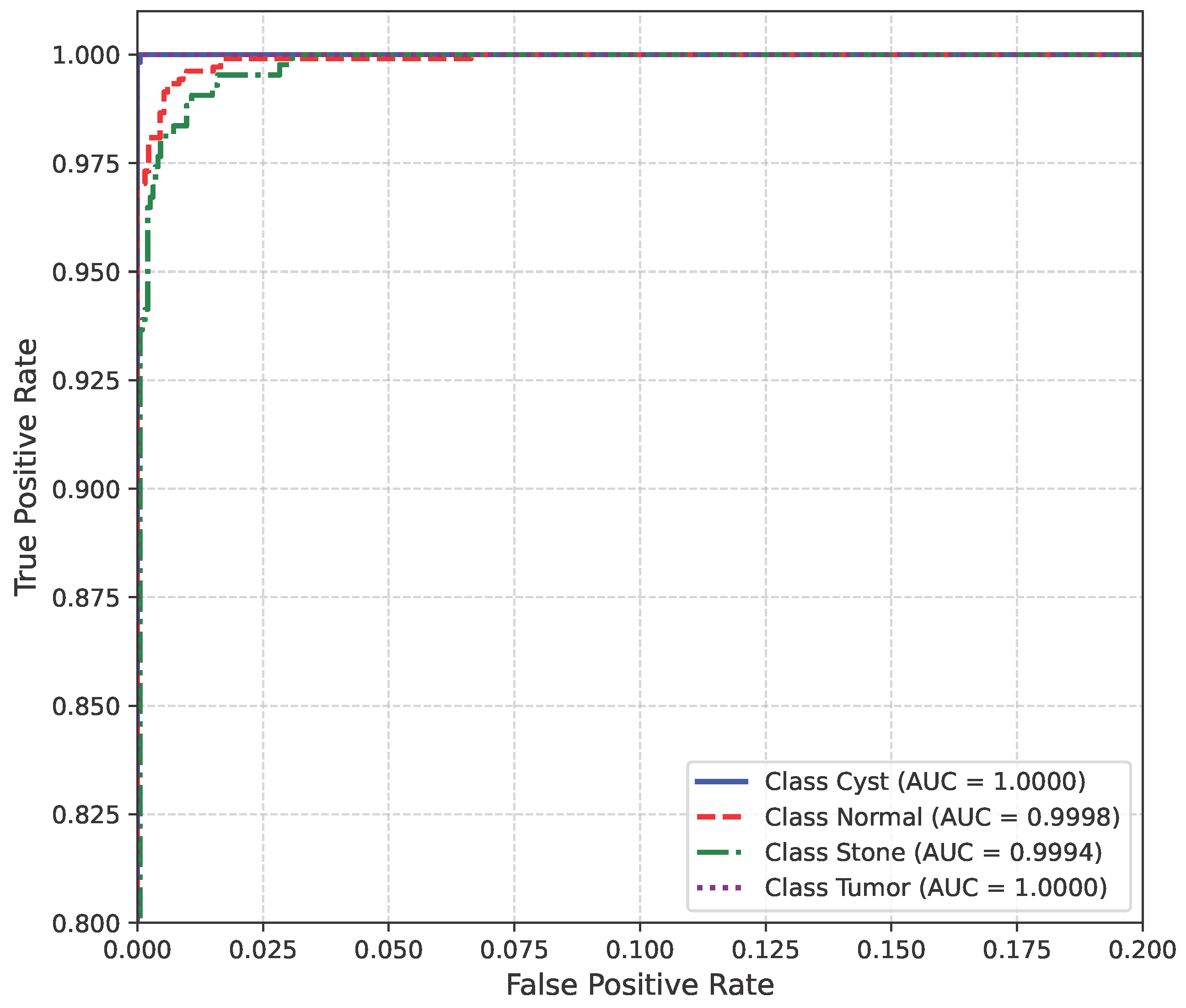 The model’s performance across the three datasets shows outstanding results on the baseline dataset, with an overall accuracy of 99.21% and near-perfect class-level performance, where all classes (cyst, normal, stone, tumor) obtained F1-scores between 0.98 and 1.00. On the contrary, almost similar results were observed on Dataset A, also achieving 99% accuracy, with only a slight decline in the stone class (F1 = 0.98), while the remaining classes, particularly cyst and tumor, maintained perfect scores. Dataset B contains augmented test samples with higher texture variability. As seen in the figures, the AUC values for all classes remain close to 1.0, indicating excellent discriminative ability. A high AUC demonstrates that the model can effectively differentiate positive and negative cases across all thresholds, providing a robust measure of performance beyond simple accuracy. The loss curves show smooth convergence without divergence between training and validation losses, suggesting that the model learned effectively without overfitting. This consistency across datasets confirms the regularizing effect of CLAHE, bilateral filtering, and SMOTE on improving generalization. Overall, while the model demonstrates impressive robustness on the baseline dataset and maintains it on Dataset A, the results on Dataset B identify the challenge in coping with more complex data distributions.