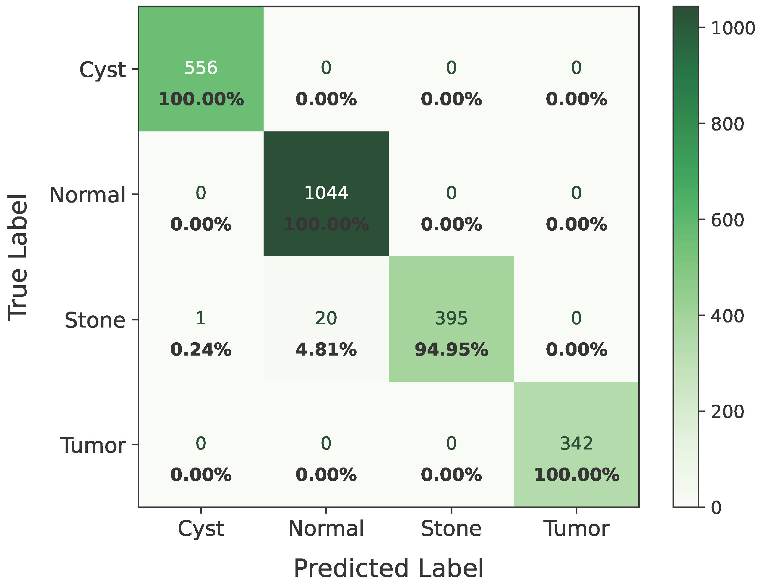 Figure 9 revealed that some stone images share overlapping visual characteristics with cyst and tumor classes, such as low-contrast textures and irregular boundaries, making them challenging to distinguish even for deep learning models.