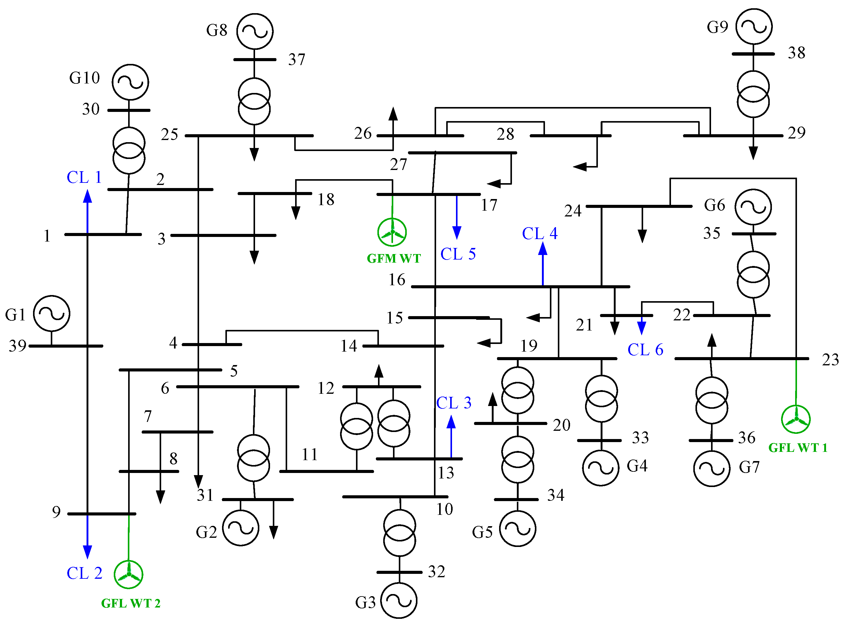 - Liu, M.; Li, Y.; Li, N.; Li, K.; Hong, Z.; Yang, W. Adaptive Frequency Control Strategy for the Coordination of Flexible Loads and Grid-Forming Wind Turbines. In Proceedings of the 3rd International Conference on Power Science and Technology (ICPST), Kunming, China, 16–18 May 2025; IEEE: Piscataway, NJ, USA, 2005. [Google Scholar]