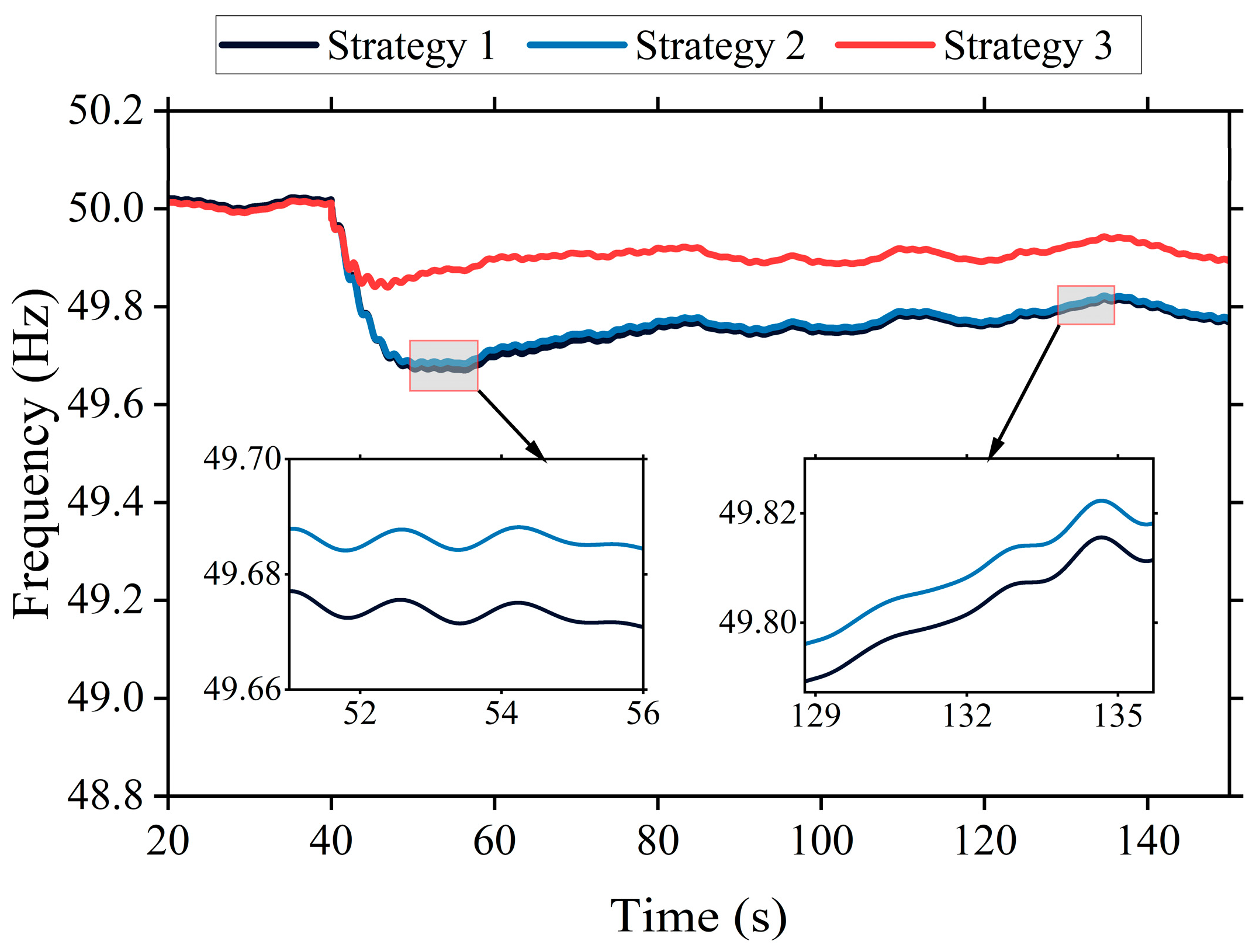 - Differentiated deadband: Building on the fluctuation data from the first condition, the frequency variation ranges at each monitoring node in the system are statistically analyzed. The maximum and minimum frequency deviations among all nodes are identified, and the largest absolute deviation from the steady-state frequency value is taken as the deadband width.