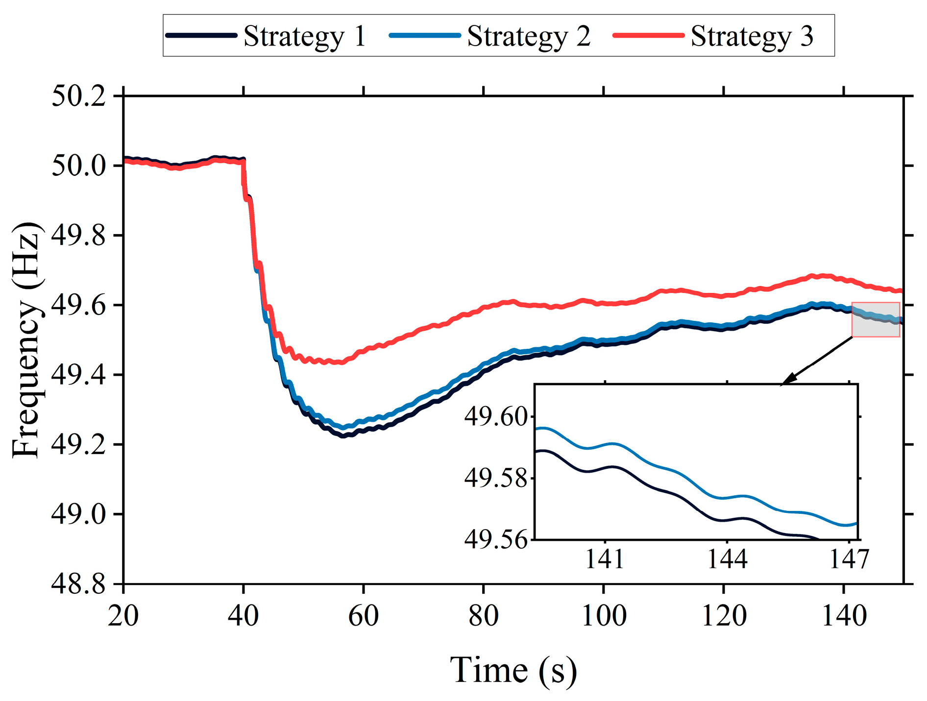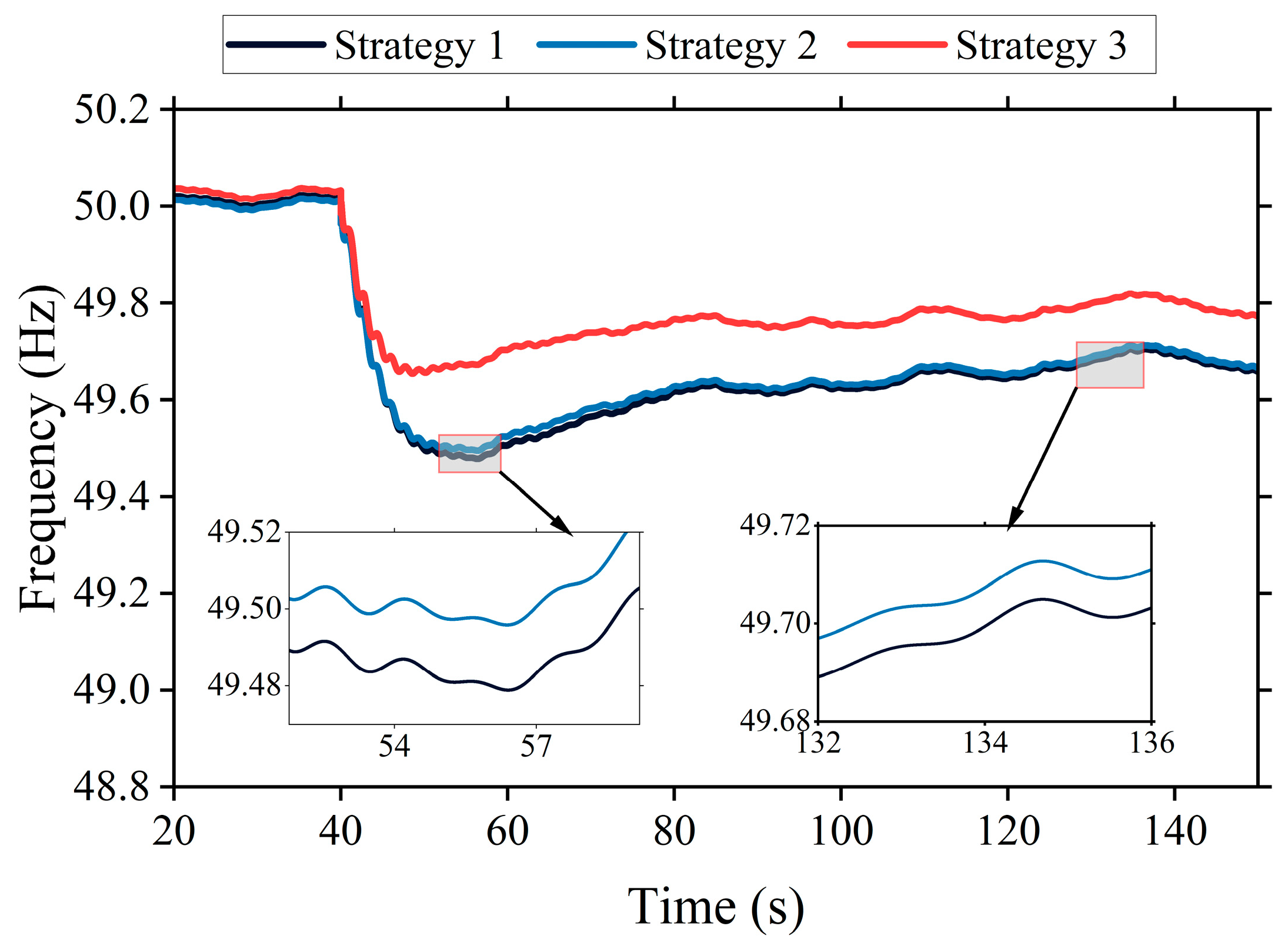 - Wu, X.; Li, Z.; Liu, F.; Zhu, L.; Duan, F.; Fan, W. Analysis of the emergency control strategy of system frequency considering system frequency distribution characteristics under large power disturbance. Power Syst. Prot. Control 2021, 49, 104–114. [Google Scholar]