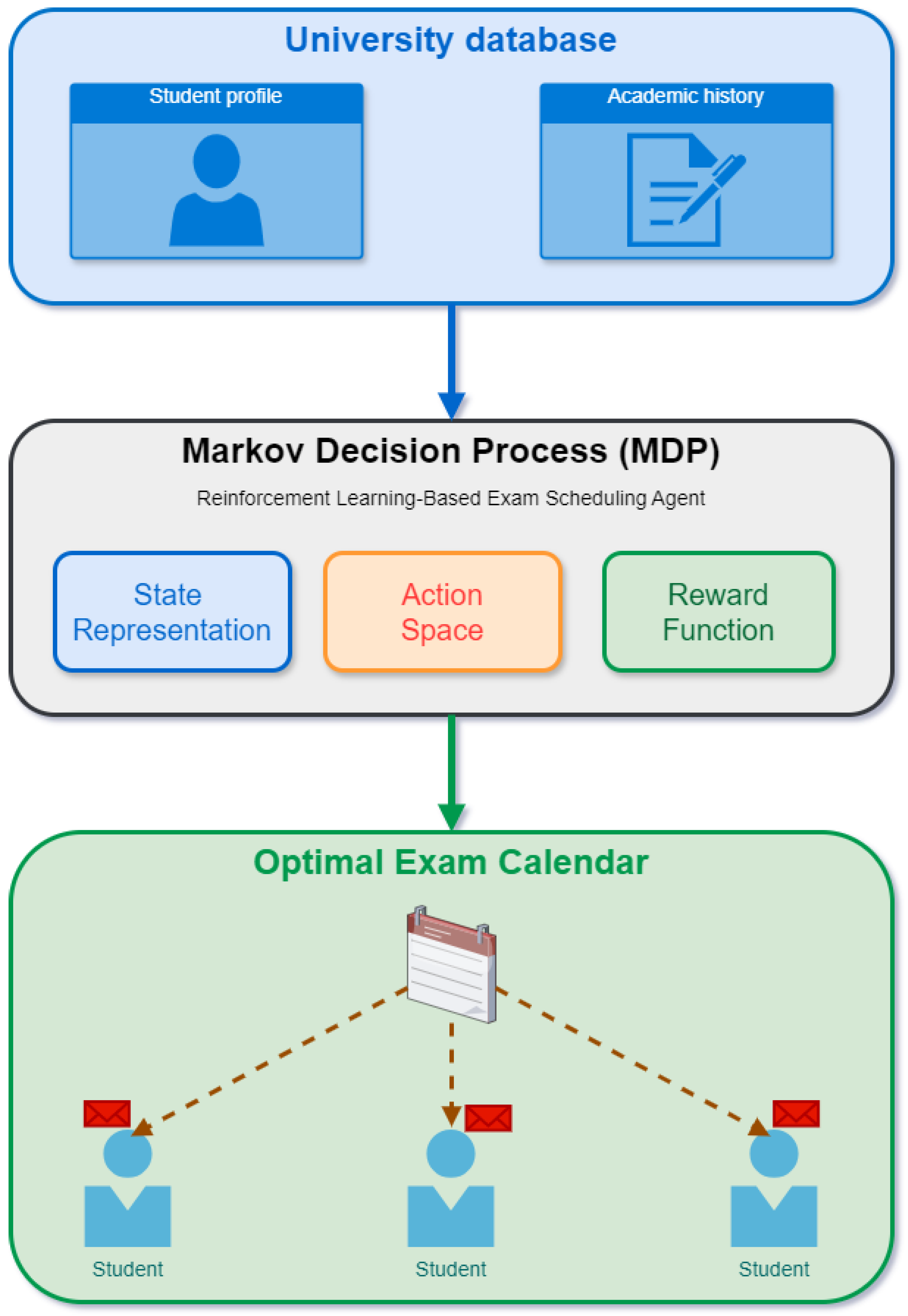 First, the examination calendar is modeled as a Markov Decision Process (MDP) by defining states, actions, and reward. Then, an RL agent continuously interacts with the educational environment comprising student performance data, curriculum structure, and learning objectives. The agent observes the current state, selects appropriate actions, and receives rewards reflecting educational outcomes. Through this iterative process, the system learns to optimize long-term objectives, such as maximizing student achievement while minimizing time to graduation. The following sections explain the process and functioning of the proposed system.