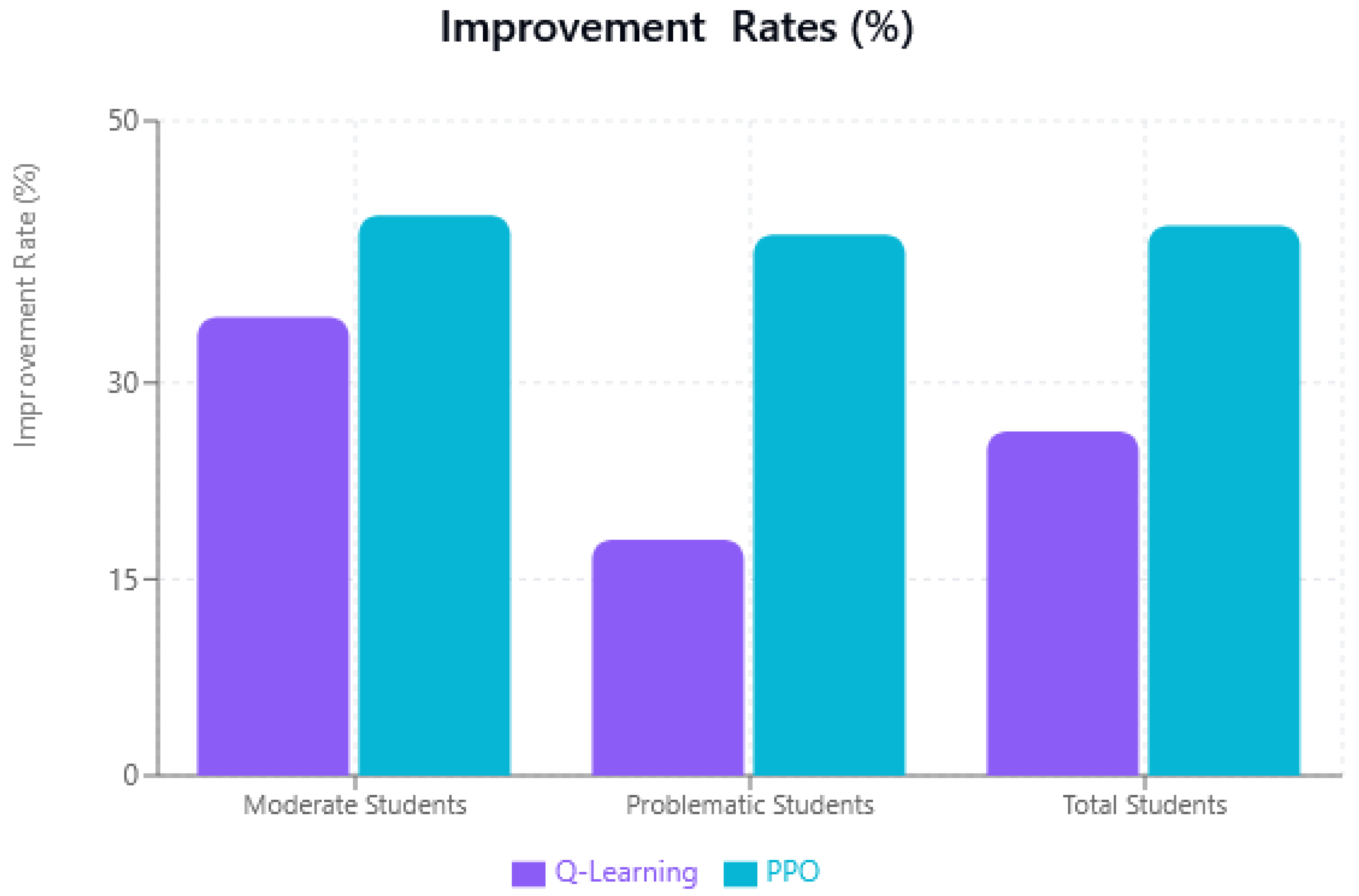 Figure 4 presents the improvement rates for each category and for each algorithm, i.e., Q-learning and PPO algorithm. Similarly,