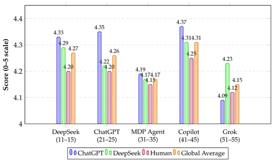 The Cronbach’s indicates good internal consistency among the three models (ChatGPT, DeepSeek, and Qwen), satisfying the conventional threshold () for acceptable reliability in group-level research. Despite minor systematic differences in absolute scoring—such as Qwen’s slightly lower mean (4.17) compared to ChatGPT’s (4.27)—the models exhibit consistent relative judgments, meaning they rank paragraphs similarly in terms of clarity and unity. Because Cronbach’s assesses the reliability of the composite score rather than absolute agreement, these small calibration biases do not compromise the validity of the aggregate measure. Consequently, the Overall Average column in Table 5 can be treated as a trustworthy and stable proxy for paragraph quality in downstream analyses.