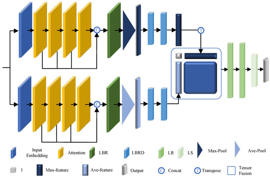 where represents the ith attention layer, the output dimension of each attention layer is the same as its input dimension, and represents the weight of the linear layer. The input embeddings and the attention mechanisms we employ will be described in detail later. The intermediate feature is obtained using the maximum or pooling operator, which is then transmitted to the two cascaded feedforward neural networks LBRD (combining the linear, BatchNorm (BN), ReLU layer, and dropout layer). At this point, we obtain the maximum pooling module output features and average pooling module output features , respectively.