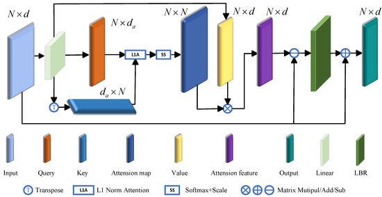 First, we obtain the L1 norm attention weight by calculating the L1 norm between the query matrix Q and the key matrix K: