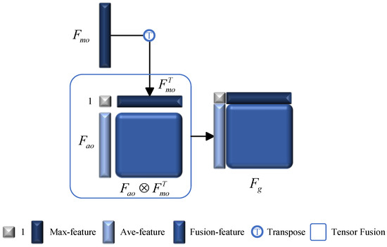 The maximum and average modules have their respective focuses. To obtain global features, we set up a fusion layer to integrate the maximum feature and average feature through explicit modeling to learn the relationship between them. Research [27] proposes an innovative framework, referred to as Tensor Fusion Network, that encompasses the learning of these dynamics end-to-end in an integrated manner. A 2D tensor fusion layer is employed to uncover the latent relationships between maximum feature and average feature modules, which is represented as the following vector field utilizing 2-fold Cartesian product: