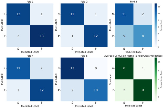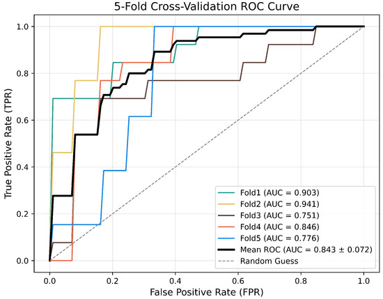 A comprehensive breakdown of the dataset’s five-fold cross-validation division and the derived outcomes are depicted in Table 7. The mean identification rate achieved through the five-fold cross-validation process stands at 87.03%. This study focuses on a binary classification task, and the confusion matrix in Figure 6 and ROC curve and AUC score (AUROC) in Figure 7 are selected as the core evaluation metrics.