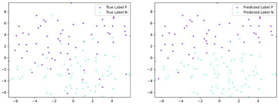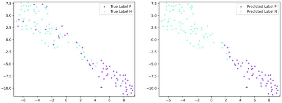 The results of the embedding layer and the feature vector following the tensor fusion layer are depicted, utilizing t-SNE for dimensionality reduction, as illustrated in Figure 8 and Figure 9. In these figures, each point is color-coded according to its label. Labels in the left figure correspond to the labels of the original data, while labels in the right figure correspond to the labels of the predicting results. It can be seen from Figure 8 that all the points are clustered together and there is no clear divide between them. However, after the first LR layer, the data distribution in Figure 9 exhibits a more structured pattern, with a clear demarcation between the predicted labels. These visualizations demonstrate that our model effectively maps the data into a space where it can be more easily distinguished, leading to improved classification performance.