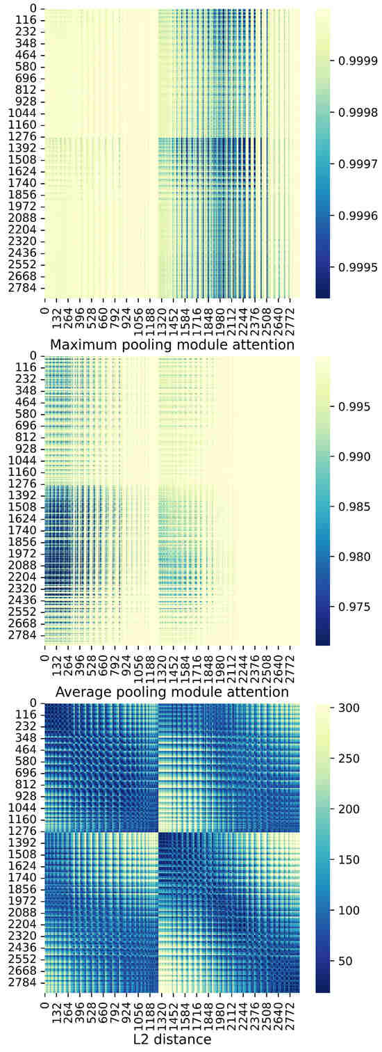 (1) Attention map of Maximum module (top). (2) Attention map of Average module (middle). (3) L2 distance (bottom).