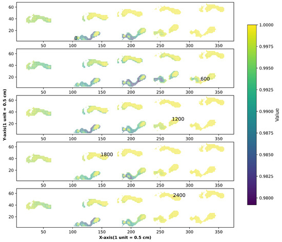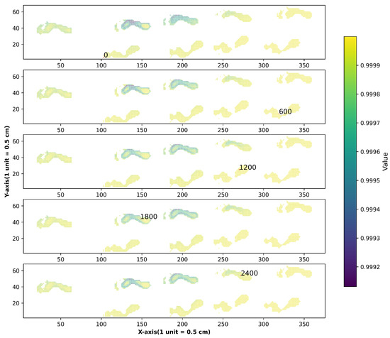 In addition, to discover the difference between the attention maps of queries on different parts of the array, we visualized attention maps in the Maximum module and Average module of queries on different parts of the array in Figure 12 and Figure 13. We found that attention maps in the Maximum module and Average module of points 0, 600, 1200, 1800, 2400 are similar in the initial stage, but the distribution difference in the later period is great. Attention maps in the Average module are sharper than that in the other. The lighter areas are mainly distributed in the middle and on the edge of the footprint in the Maximum module attention maps but in the middle of the footprint in the Average module attention maps.