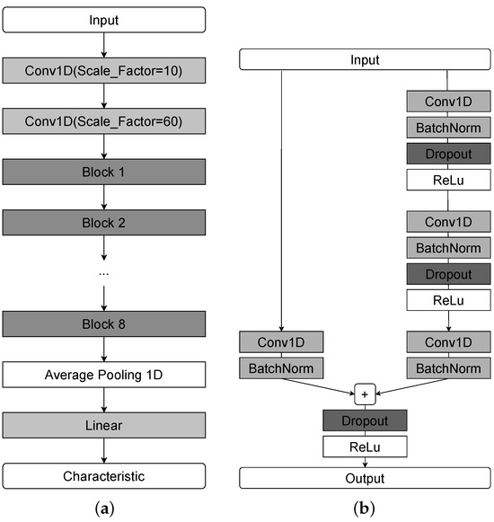 To reduce the original time resolution before residual blocks, we introduced two initial convolutional layers. Each residual block contains convolution, batch normalization, and dropout layers. The network is composed of multiple such blocks (eight in our implementation), followed by a global average pooling layer and a fully connected layer. The compression ratio of the Conv1d layers and the number of residual blocks were optimized via grid search.