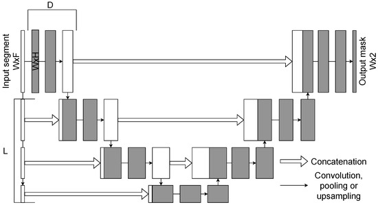 The U-Net model is one of the most widely used CNN architectures for segmentation tasks. The 1D U-Net is an adaptation of the original 2D image segmentation model to one-dimensional sequential data, making it well suited for biomedical signal analysis, including EEG. The schematic representation of the 1D U-Net architecture is presented in Figure 3.