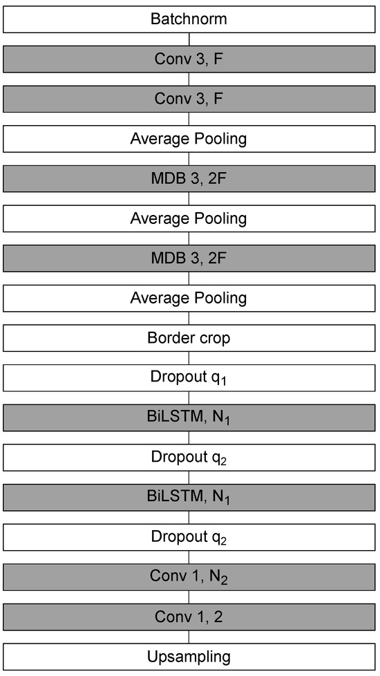 The architecture of SEED is illustrated in Figure 4. It begins with two one-dimensional convolutions (kernel size = 3, output channels ), followed by max pooling and convolutional multi-dilated blocks (MDBs), which capture patterns across multiple temporal scales. Boundary shortening is applied to align feature maps, and two dropout layers (, ) provide regularization. Contextual dependencies are modeled by BiLSTMs with hidden units. The final classification stage uses two one-dimensional convolutions (kernel size = 1): the first maps to features, while the second produces two output channels corresponding to event vs. background classes.