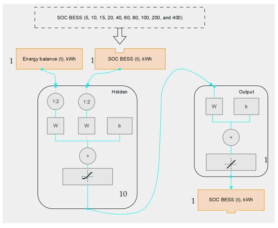 Inputs (NARX Network). This architecture is well-suited for modeling and predicting time-series data, as it learns to forecast the State of Charge (SOC) of the Battery Energy Storage System (BESS) using both past SOC values and previous energy balance values, as illustrated in Figure 2, where W and b represent the weight and bias parameters of the activation function, respectively. The weight (w) determines the influence on the neuron’s activation, while the bias (b) term allows the activation function to shift its response. The analysis comprises ten hidden layers and a single output layer.