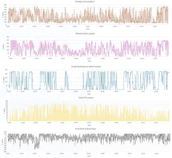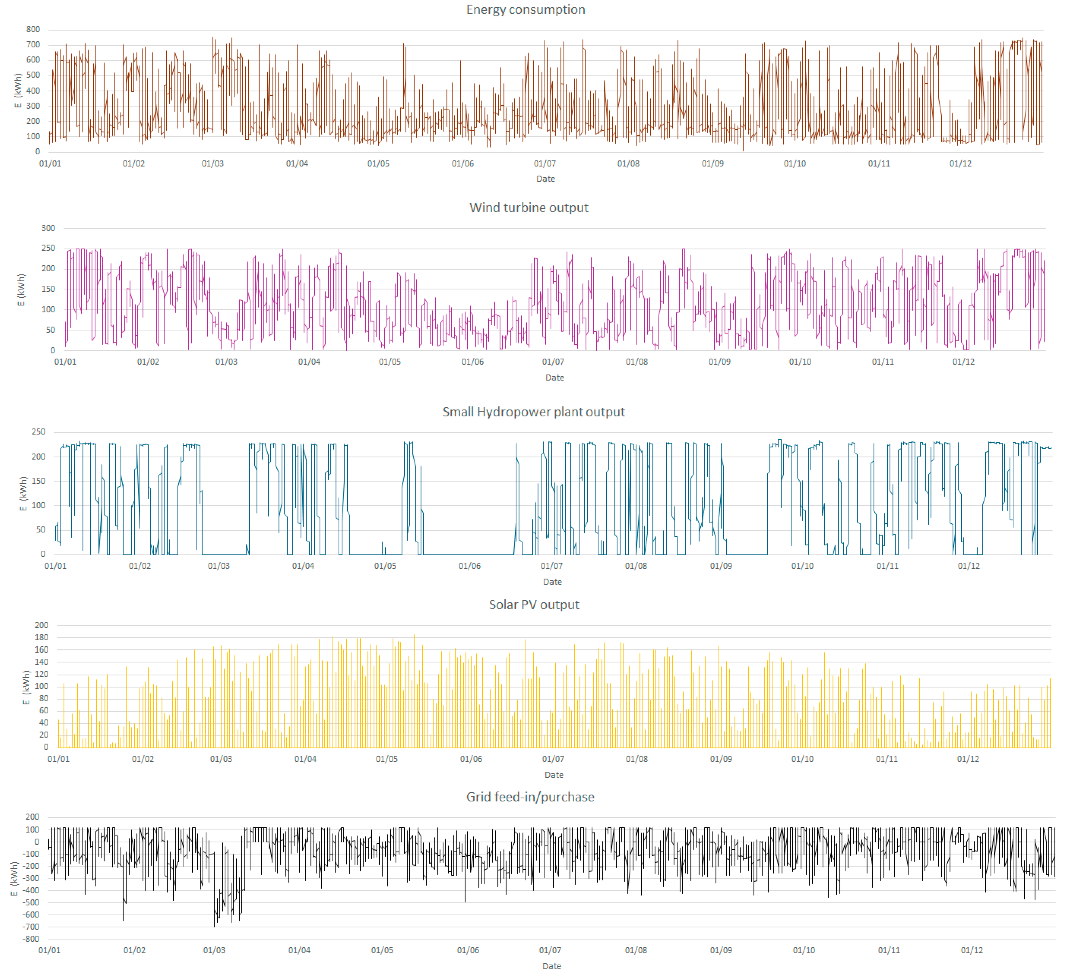 Figure 3 presents a series of five time-series plots that collectively illustrate the dynamics of energy consumption, renewable energy generation, and grid interaction within a micro-grid system over the course of an average year. The top plot shows daily energy consumption (kWh), characterized by frequent fluctuations and distinct peaks, reflecting variable demand patterns across each month. The second plot displays the wind turbine output, which varies significantly over time, indicating the intermittent nature of wind energy availability. The third plot represents the small hydropower plant output, which remains relatively stable, suggesting consistent and predictable generation from this source. The fourth plot captures the solar photovoltaic (PV) output, exhibiting a clear diurnal cycle with pronounced peaks during daylight hours and zero output at night, consistent with solar irradiance patterns. Finally, the bottom plot illustrates grid feed-in and purchase, with values oscillating between positive and negative, signifying alternating periods of importing energy from the grid to compensate for the missing and exporting when there is excess or production. Together, these plots provide a comprehensive overview of the temporal behavior of energy flows within the micro-grid, highlighting the VFR complementary roles of wind, hydro, and solar sources in meeting consumption needs and managing grid interactions.