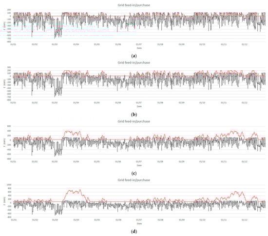 Grid Interaction of BESS with Different Capacities (kWh) in a Hybrid renewable energy system: (a) 80 kWh; (b) 200 kWh; (c) 400 kWh; (d) 800 kWh (gray is grid feed/purchase and red is the battery compensation).