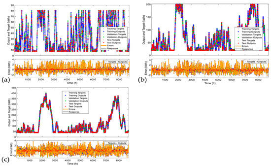 Figure 5 illustrates the predicted and target SOC–BESS values for battery capacities of 80, 200, and 400 kWh, showing an excellent agreement between the simulated and observed time-series data. Overall, the calculations conducted using MATHLAB R2024b, the NARX Network accurately reproduced the SOC–BESS time series across the training, validation, and testing phases, confirming its ability to model the system’s dynamic behavior effectively.