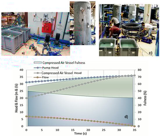 Figure 6 presents a composite visual overview of experimental infrastructure and operational data related to CAV energy storage research conducted at the Hydraulic Laboratory of Instituto Superior Técnico (IST). Figure 6a shows the Hydraulic Lab at IST, likely depicting the physical set-up used for testing. This may include pipelines, pumps, valves, sensors, and control systems arranged to simulate real-world conditions. Figure 6b illustrates the system operation and measurement framework, detailing how various parameters—such as flow rate, pressure, and pumps (single or in series)—are monitored during dynamic processes. It includes schematic representations or time-series plots showing how the system responds under different operating conditions. Figure 6c focuses on CAV fullness during a pumped-storage operation, capturing the temporal evolution of volume and pressure head. This figure shows how CAV behavior correlates with operational parameters, informing both predictive modeling and control strategies.