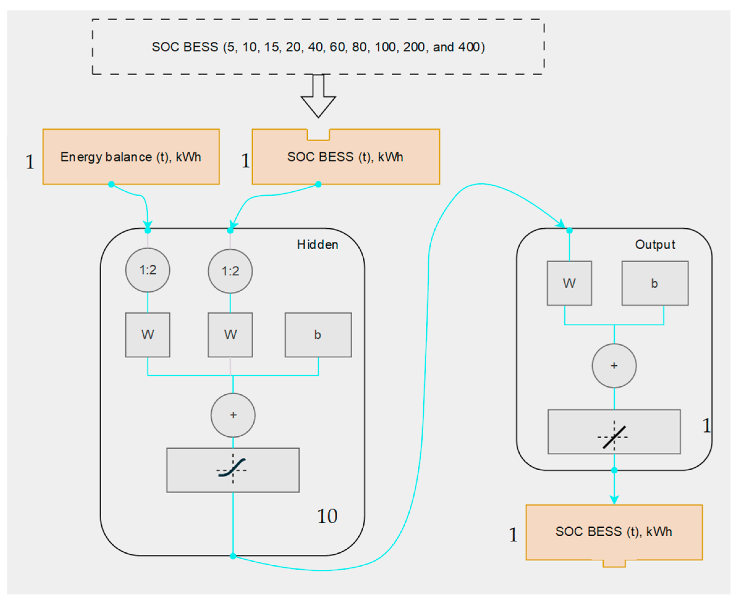 Inputs (NARX Network). This architecture is well-suited for modeling and predicting time-series data, as it learns to forecast the State of Charge (SOC) of the Battery Energy Storage System (BESS) using both past SOC values and previous energy balance values, as illustrated in