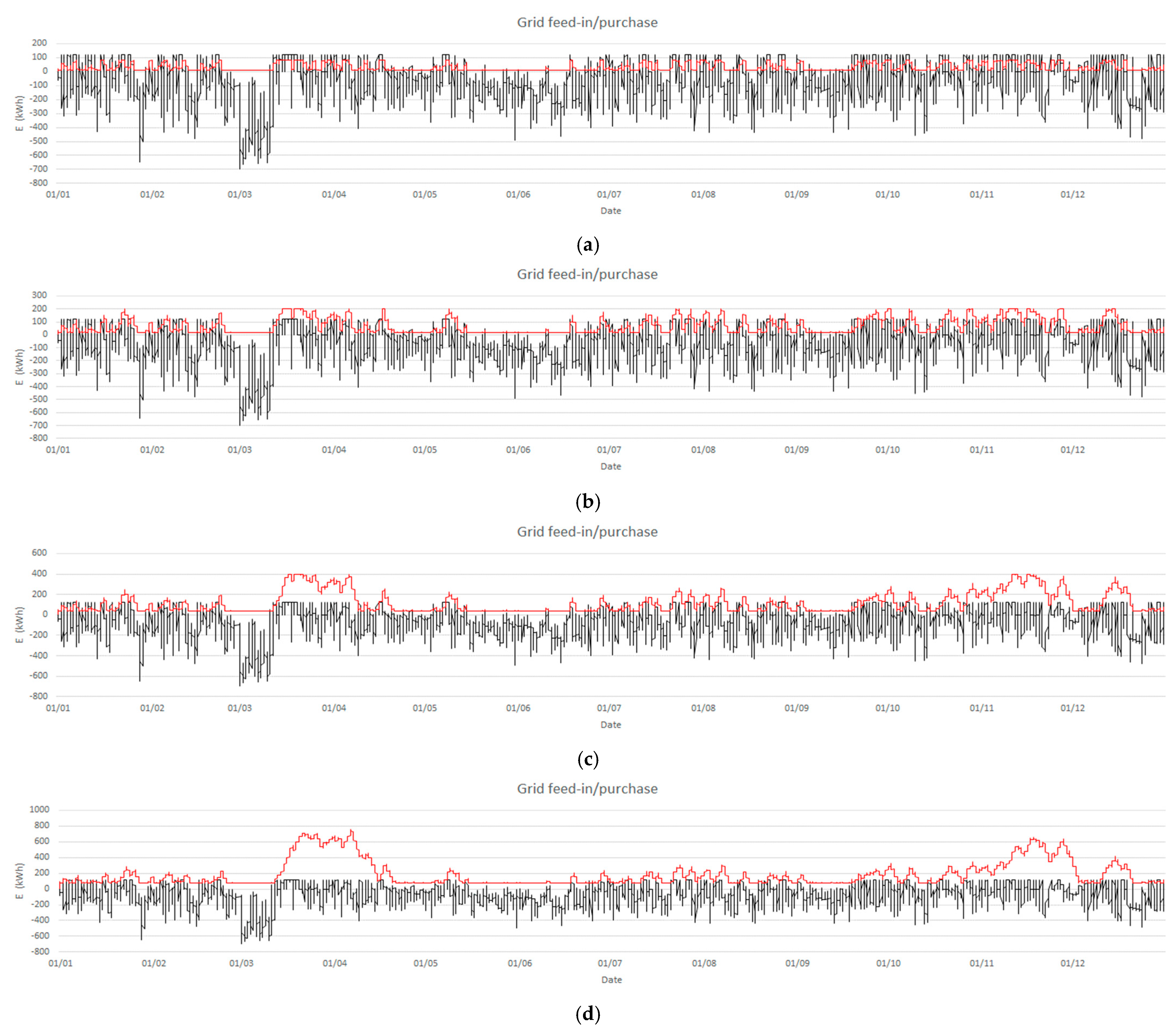 Figure 4 comprises four time-series plots labeled (a) through (d), each depicting the variation in grid feed-in and purchase over time within a micro-grid system for different battery capacity. Each plot includes two curves: a black line showing the grid interaction and a red line representing the battery contribution that in certain cases can avoid grid import. Graph (a) shows relatively stable grid/battery exchange with minor fluctuations, while graph (d) exhibits the behavior of a higher battery capacity with the highest grid exchange values among the four scenarios.