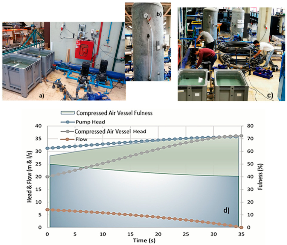 Figure 7). This study inspected the Compressed air vessel idea from the amount of attainable hydraulic power and energy produced, similar to a water-battery. The presented data for a prototype at a scale 1/30 relative to the lab set-up demonstrates encouraging values of hydraulic power, having the maximum values of 6142 kW, while the maximum power of the model was equal to 41 W when a succession of water hammer valve closures allowed a pressure wave as an energy storage solution.